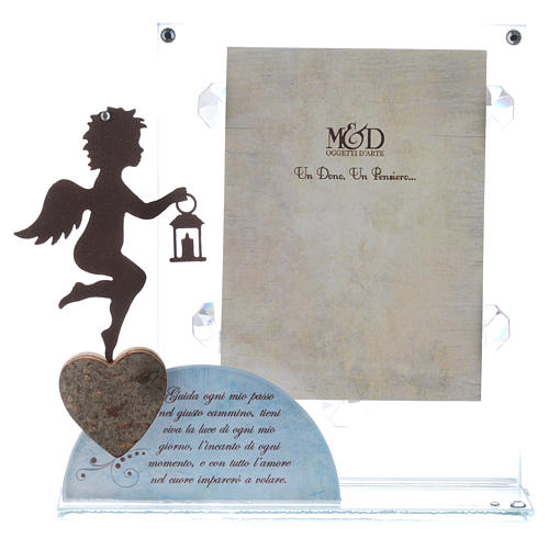 This frame is made of glass with decorations in wood, metal and crystal. Suitable for pictures measuring 6x9cm.