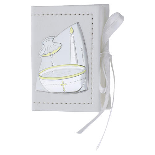 Baptism rosary holder in leather imitation with image in double laminated silver. Rosary holder chest made in leather imitation with silver plate in relief. The rosary holder, equipped with rosary, is suitable as a bombonniere or as a baptism gift.