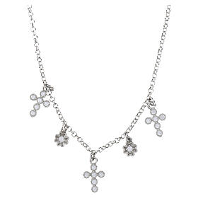 Benedictus silver necklace with cross and flower charms, white rhinestones, rhodium-plated finish