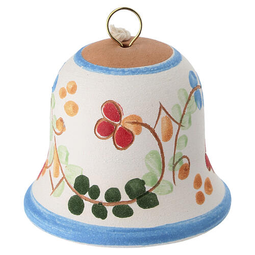 Glazed terracotta bell with a hand-painted floral decoration in shades of light blue, green and red, made in Italy using traditional artisan techniques.