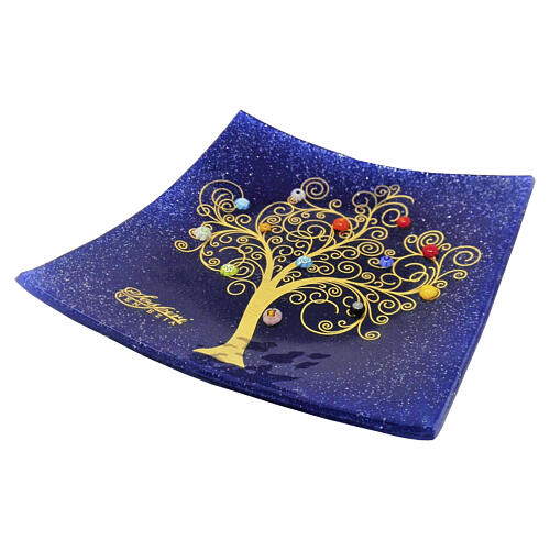 Handcrafted centerpiece decorated with a Tree of Life in 24k gold and Venetian murrine in Murano glass on an intense blue background.