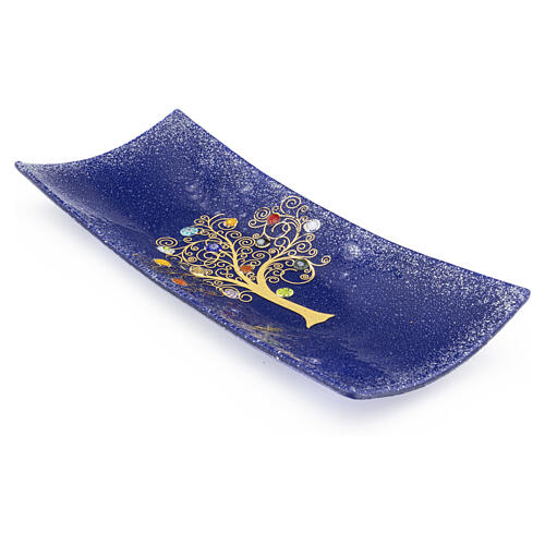 Blue valet tray decorated with Murano murrine and a central Tree of Life motif in pure gold leaf.